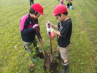当日は天気にも恵まれ、阿部造園さんのもと、親子で一緒にサクラやミズナラ、ブルーベリーなど、たくさんの樹種を植えました。